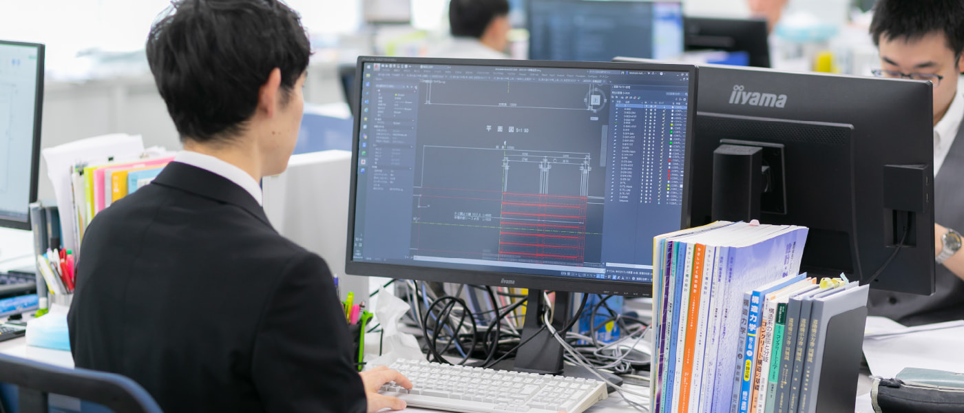 建設業と製造業、両方の視点を持つ設計として、営業・製造・施工と連携しながら最適解を導きます。「なぜこの設計なのか」を論理的に説明し、技術的な最終判断を下す存在として、高い専門性を発揮し、社会基盤を支える中核を担う仕事です。